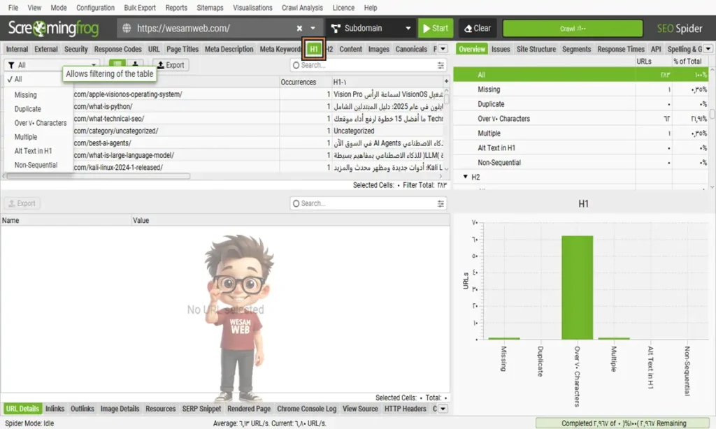 - يبدأ Screaming Frog بعملية الزحف (Crawling) على جميع صفحات موقعك، تمامًا كما يفعل جوجل.